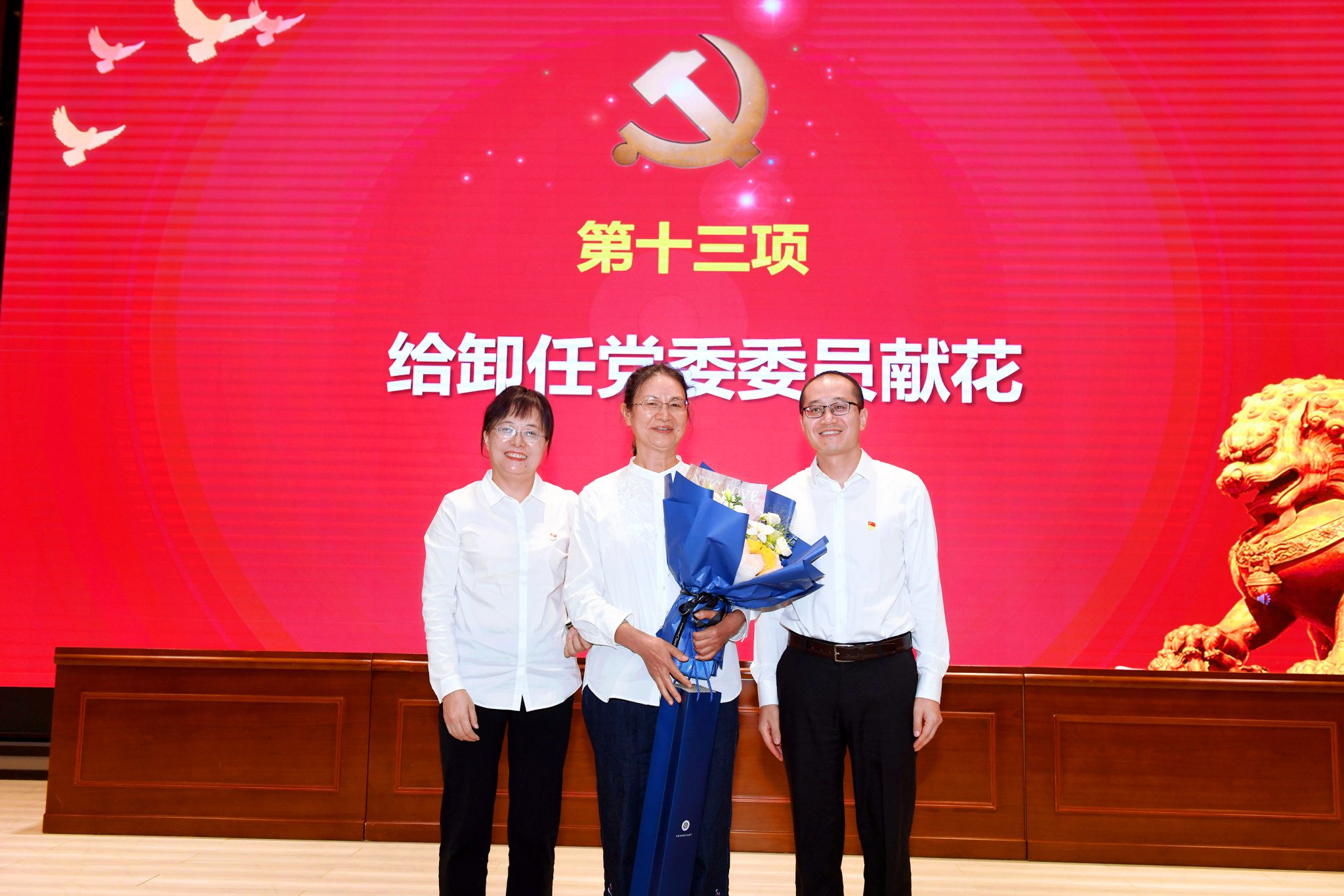 在热烈的掌声中,廖军同志、田永秀同志为卸任党委委员冉绵惠同志献花,感谢冉老师8年来兢兢业业的工作和对学院建设发展做出的贡献。