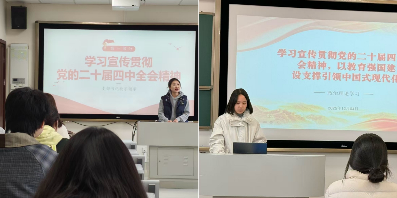 两支部坚持将理论学习作为党性锻炼与学风建设的基础。本科第一党支部通过“理论学习+专题研讨”模式,组织党员深入学习《党的二十届四中全会〈建议〉学习辅导百问》,重点学习领会教育在强国建设、民族复兴中的战略支撑作用。本科第二党支部开展“学习宣传贯彻党的二十届四中全会精神”专题党课,党员代表结合马克思主义理论与专业学习,分享“中国式现代化与青年使命”学习体会,引导全体党员筑牢信仰之基、把稳思想之舵。