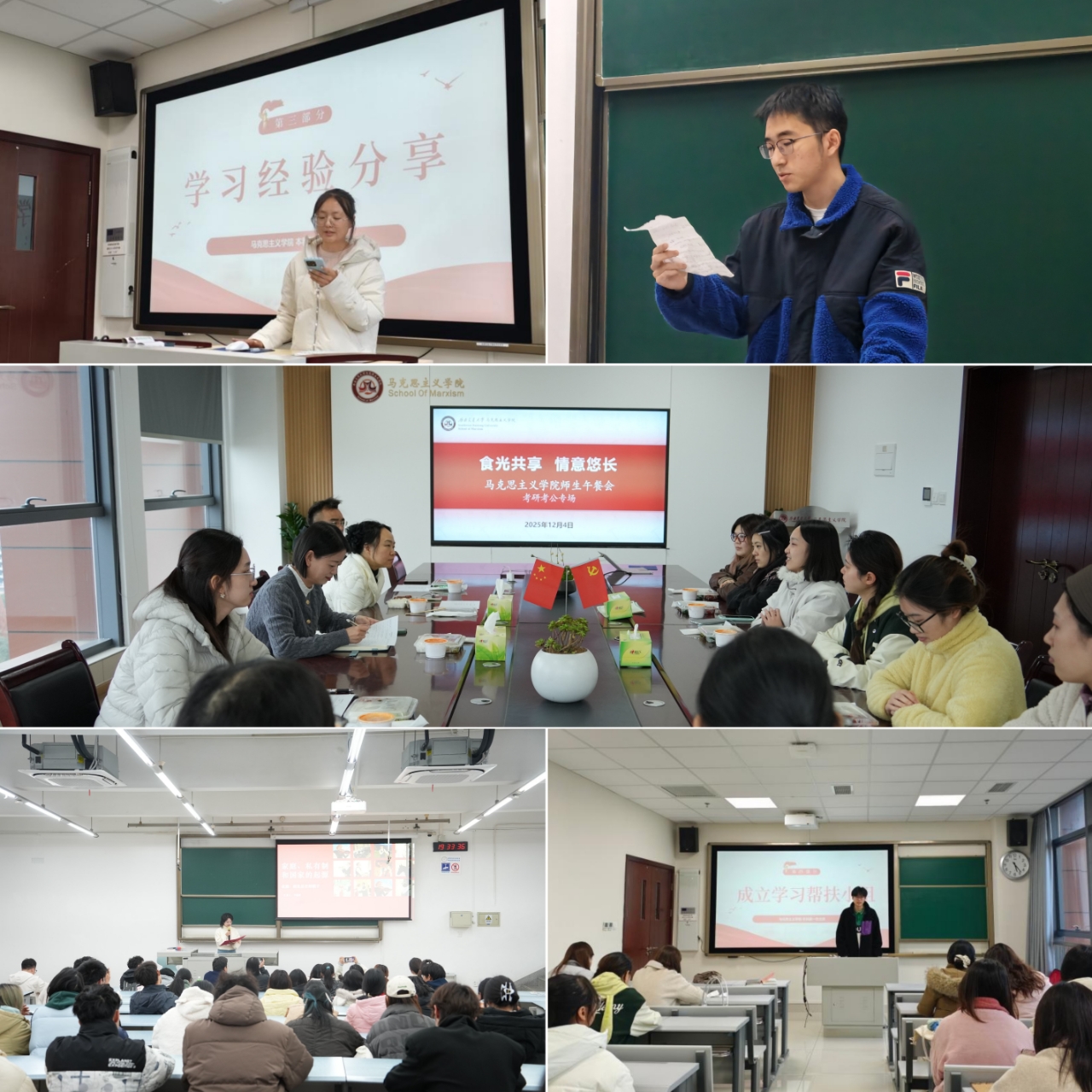 两支部围绕学生实际需求,构建多元化学业支持体系。本科第一党支部举办学习经验交流会,邀请优秀党员分享课堂参与、压力调适、应试技巧等实战经验,并组建党员先锋学习帮扶小组,开展“专题答疑”等针对性辅导。本科第二党支部则打造“三维一体”学业帮扶体系,开展期末复习指导会,组织“青马悦读会”理论提升计划,通过分组阅读、集体研讨、情景朗诵等形式推动理论入脑入心;举办“食光共享·情意悠长”师生午餐会,围绕考研、考公等学业发展话题开展师生面对面交流,为学生成长答疑解惑。