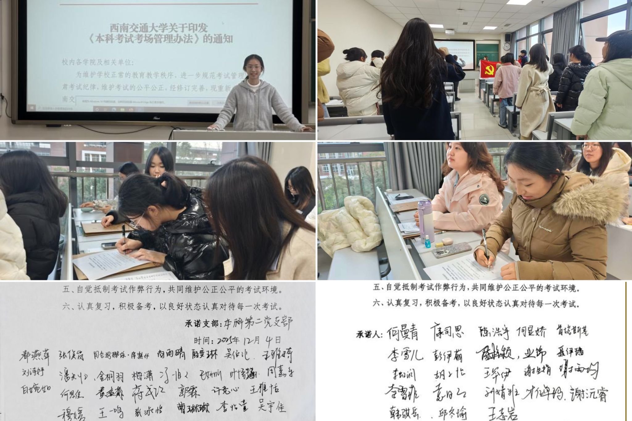 本科生考试违规处理办法》《本科考试考场管理办法》等制度,通过案例剖析、情景模拟开展警示教育。本科第一党支部举行庄严的《诚信考试承诺书》签订仪式,党员面向党旗宣誓,将诚信要求与入党誓词精神相呼应;本科第二党支部发起诚信考试倡议,号召全体党员严于律己,共同维护公平公正的考试环境。