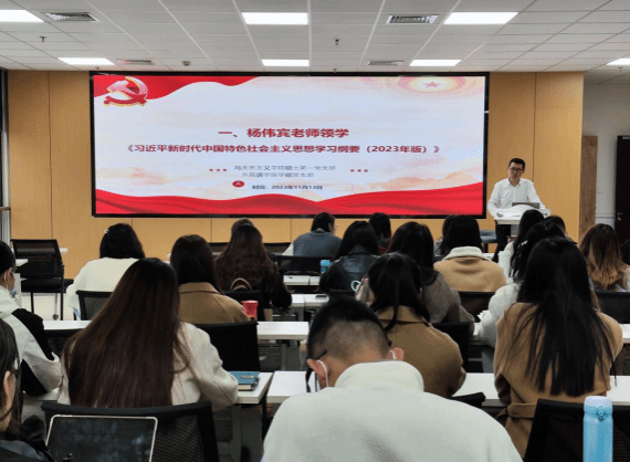 杨伟宾老师对照《习近平新时代中国特色社会主义思想学习纲要(2023年版)》就怎么学、学什么的问题,展开了内容丰富的领学。首先,杨老师讲授了习近平新时代中国特色社会主义思想产生的时代背景和重大意义,强调对习近平新时代中国特色社会主义思想要结合时代学、结合实践学。其次,杨老师结合同学们的学习生活,举出了生动鲜活的例子,把理论学习与日常生活关联起来,极大激发了同志们的学习热情和兴趣。与此同时,杨老师建议同志们要结合专业方向和学习兴趣展开思想理论学习,始终坚持马克思主义的立场、观点和方法。