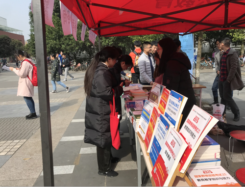10月份,针对全校学生在犀浦校区二食堂门口开展公益性书展,期间共有约2000名以上学生参与活动,并当场针对部分同学关心的公务员报考和选调生报名的问题进行了耐心的解答。同时收集有意愿报考公务员的学生信息,为下一次活动的做准备。