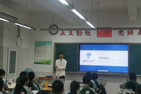 6月8日,为进一步深化党史学习教育,激励当代青年努力成为堪当民族复兴重任的时代新人,博士宣讲团成员冷书恒赴成都外国语学校高新校区开展党史学习教育及招生宣讲。