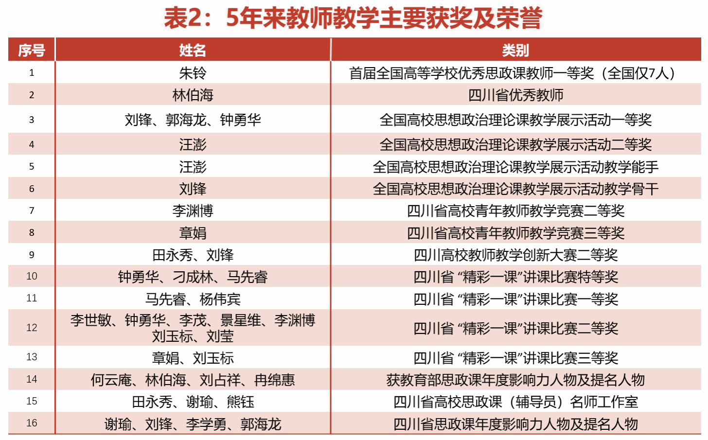 学院以“政治要强、情怀要深、思维要新、视野要广、自律要严、人格要正”要求为根本导向,实施名师培育、青苗帮扶、特聘教授、优秀团队“四大行动计划”,全力提升教师的教学能力水平,着力培养可信可敬可靠、乐为敢为有为的思想政治理论课教师队伍,成效显著。近年来,朱铃教授获首届全国高等学校优秀思政课教师一等奖(全国仅7人),林伯海教授获四川省优秀教师;在全国高校思想政治理论课教学展示活动中获一等奖3人、二等奖2人,教学能手1人,获教学骨干1人;在四川省高校青年教师教学竞赛中获二等奖1人、三等1人;在四川高校教师教学创新大赛中获二等奖2项;在四川省的“精彩一课”讲课比赛中获特等奖3人、一等奖2人、二等奖8人、三等奖2人;获教育部思政课年度影响力人物及提名人物4人,四川省高校思政课(辅导员)名师工作室3个,