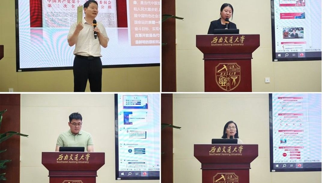 刘玉标、李渊博、刘晓玲接着分别以“学习贯彻党的二十届三中全会精神”“牢牢把握高质量发展首要任务,积极培育和发展新质生产力”“弘扬和平共处五项原则,携手构建人类命运共同体”为题,对本学期的教学专题的设计思路和主要内容进行了详细介绍。