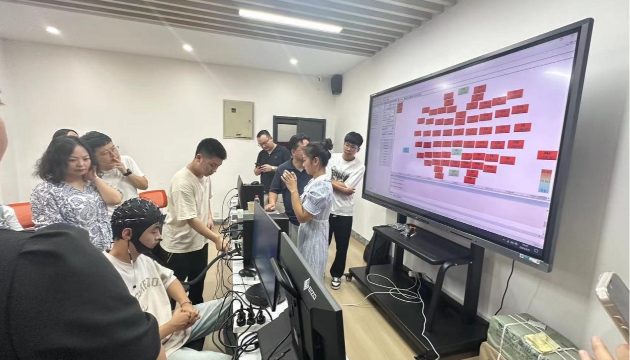 在上午的工作坊中,我院师生对Neuroscan 64-256导脑电采集系统的工作原理、使用方法进行了探索。在工作坊中,师生系统学习了脑电信号的采集以及数据处理的相关流程,掌握了通过仪器快速采集并分析脑电信号,并进行对可视化处理的方法。在实验阶段,师生对被试人员大脑活动状态,以及不同刺激下被试人员的接收反应进行了测试。