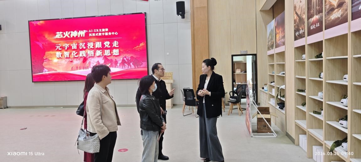 在威爱科技相关负责人陪同下,我院团队首先参观了AI+XR主旋律沉浸式数字服务中心。该中心全面集成人工智能,元宇宙、数字孪生多模态内容生成等多项前沿核心技术,构建起高度沉浸、强交互、可感知的数字化教育场景。通过头戴式显示设备与智能交互系统,体验者能够“走进”百年党史中的重要历史时刻,身临其境地感受革命先辈的奋斗历程。