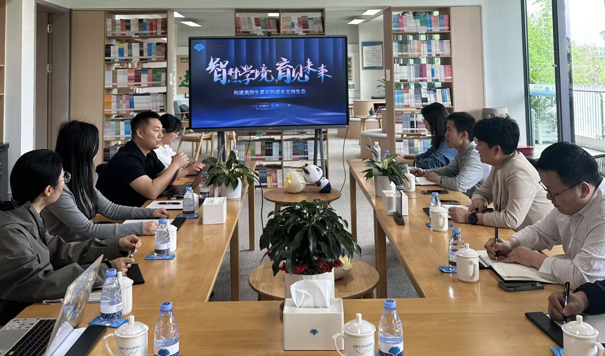 随后,实验室一行与成都七中东部学校教师代表,围绕智慧校园建设与“人工智能+教育”伦理实践开展座谈交流。座谈会上,陈主任介绍了学校依托人工智能构建离师生最近的成长支持生态的具体实践。他指出,在“数字七东,智慧学境”的总体目标指引下,学校重点打造“晓我心智”数据采集综合平台,引入“晓七”AI数智语音陪伴系统,有效弥补了传统教学管理手段难以精准洞察学生真实、个性化需求的短板,推动技术实现从“管理”学生到“滋养”学生的转变。随后,教师代表林燕具体展示了学校如何采集、分析与应用教学数据。重点强调了数据采集过程中的无感同行与知情同意原则;数据分析过程中的数据脱敏与安全保障措施;数据应用过程中“知心、舒心、润心、安心”的价值追求。为实验室开展“人工智能+教育”中的伦理问题研究提供了实践层面的参考。