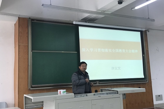 许义文教授对于教学计划中的“学习贯彻全国教育大会精神” 专题进行了备课辅导,详细介绍了全国教育大会的主要内容及其重要意义,并对全国教育大会及我校教育工作会议的主要内容进行了讲解。许义文教授以生动详实的案例向与会教师讲解了“教育是国之大计、党之大计”。