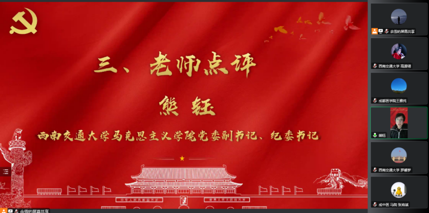 熊书记对第一分会场的宣讲活动进行了点评。她对同学们的宣讲表示了充分的肯定,认为以上同学的宣讲具有较强的示范性和代表性,内容准确丰富,过程可圈可点。同时她以精准、鲜活、厚度三个关键词,对宣讲活动提出方法指导。