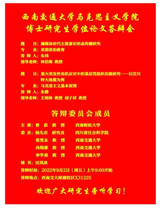 2022年9月博士研究生答辩的通知