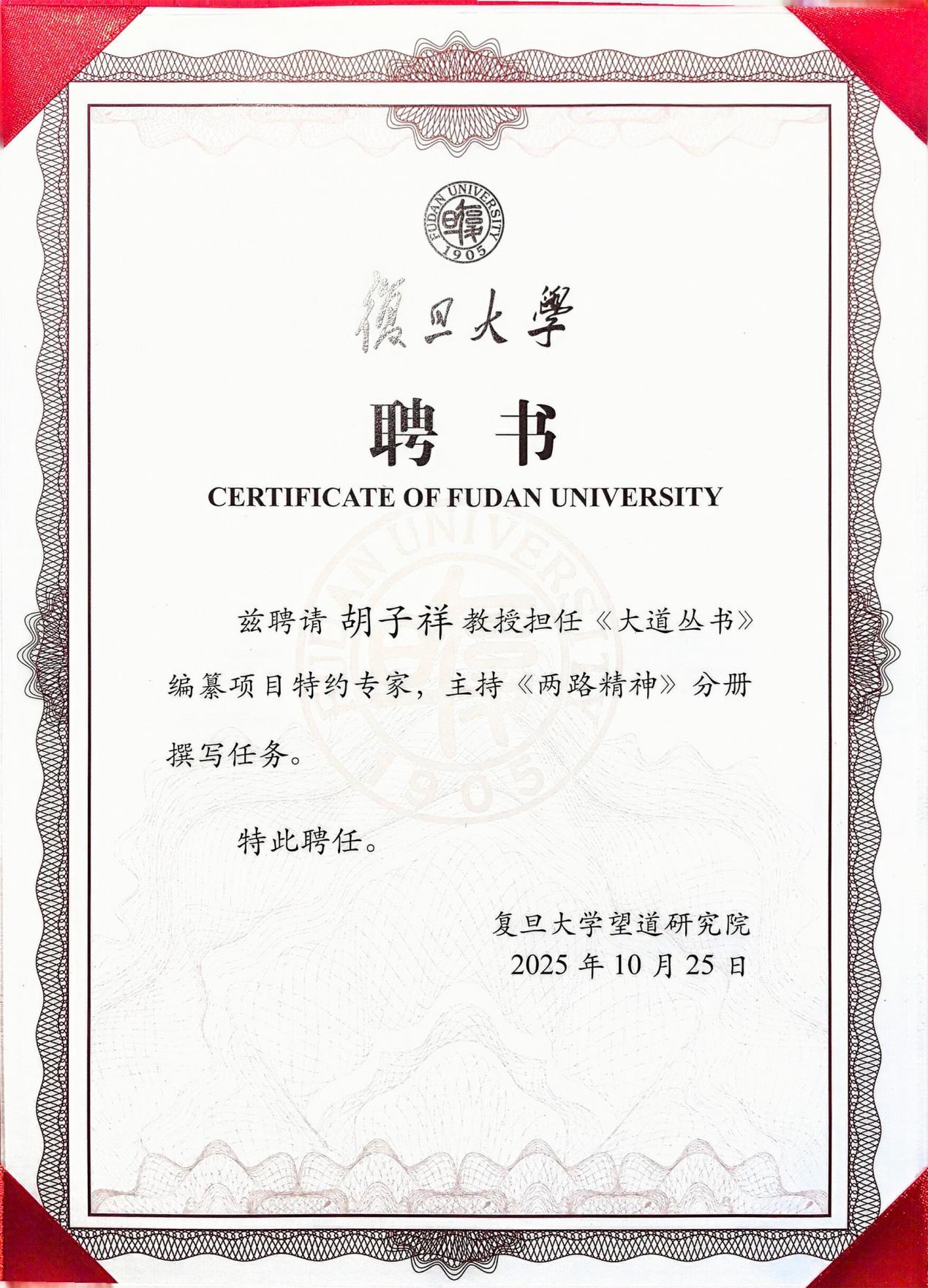 在推进会上,胡子祥教授被复旦大学望道研究院聘为《大道丛书》编纂项目特约专家,主持《“两路”精神》分册撰写任务。