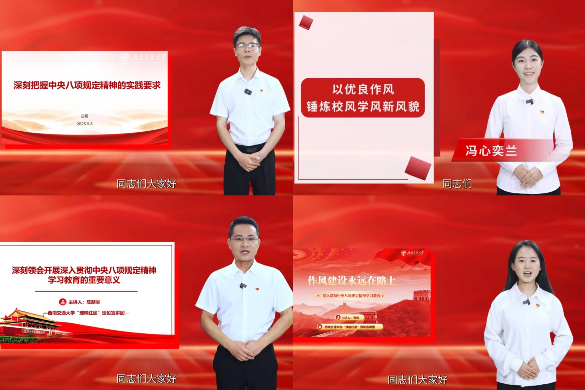 宣讲团着力丰富宣讲供给体系。年内系统上线2期主题宣讲菜单,聚焦习近平新时代中国特色社会主义思想、深入贯彻中央八项规定精神学习教育、红色记忆、青年强国梦、中华民族共同体、乡村振兴及党的二十届四中全会精神等核心主题,并围绕菜单累计开展宣讲50余场,覆盖听众3300余人次。组织成员参与录制面向全校的中央八项规定精神学习主题系列微党课4集,以多样化载体推动理论入脑入心。