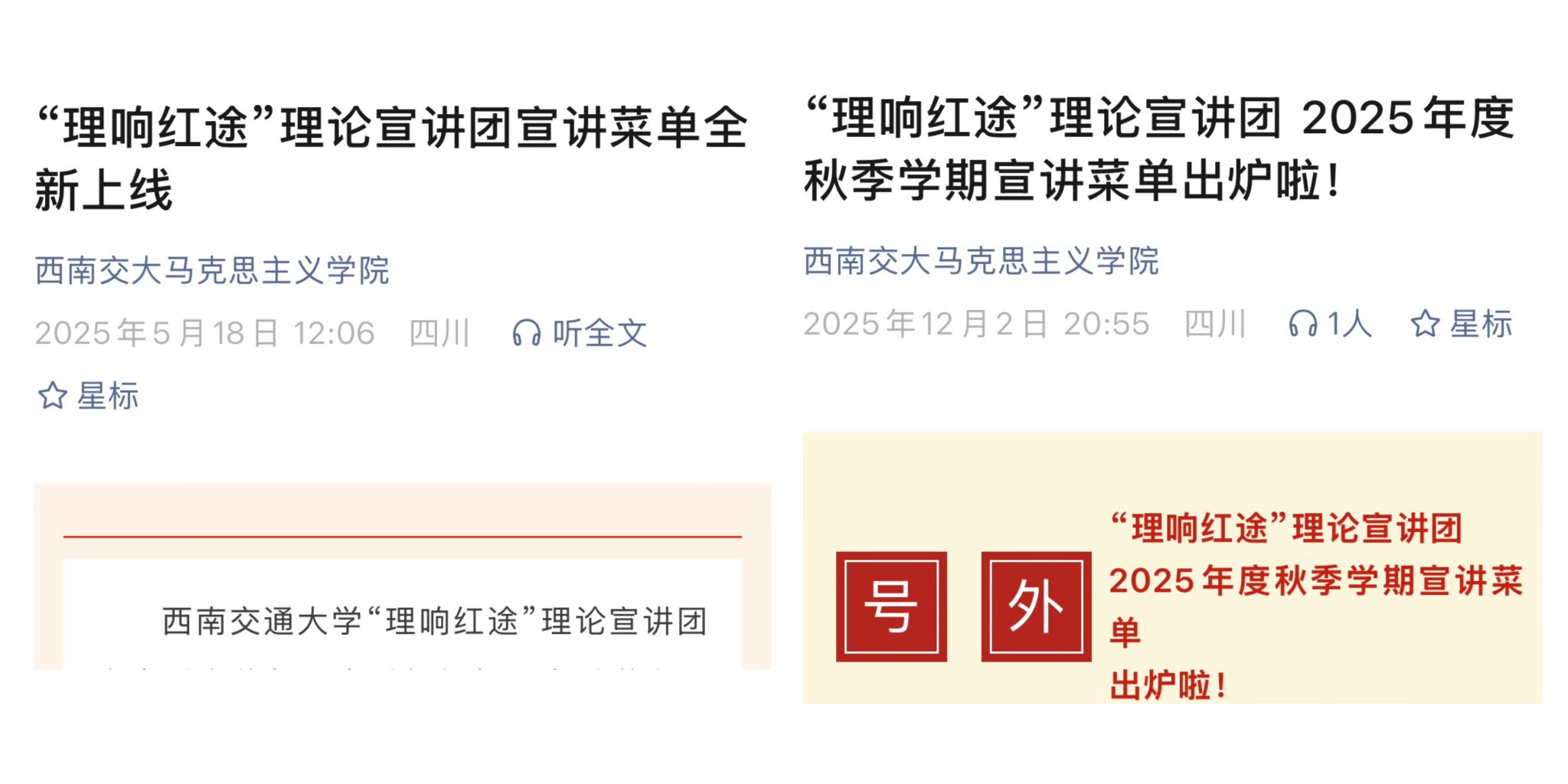 宣讲团积极构建开放式宣讲格局。与攀枝花市联合开展“共同富裕·幸福说”三级联动巡回示范宣讲;参与成都广电“名嘴走基层”宣讲活动;在第二届川渝青年马克思主义者论坛中,与7所双一流高校学子开展主题联学;与电子科技大学、四川师范大学、西安交通大学、西北大学等高校研究生理论宣讲团进行交流共建;与清华大学、北京大学等12所高校举办线上联学联讲;参与第二届蓉城高校学子联合宣讲活动;走进江油市太白中学开展基层宣讲。团队荣获2025年四川省高校基层理论宣讲大赛二等奖,品牌影响力持续彰显。