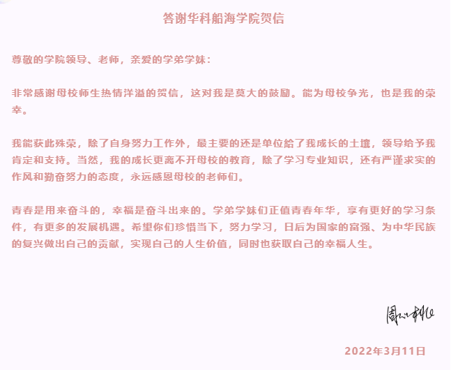 日前,我院向中国船舶701所周心桃校友发去贺信,祝贺其获评“全国三八红旗手”荣誉称号。周心桃校友给母院回信答谢,她表示收到贺信非常激动,这是对自己巨大的鼓励,能为母校争光,是她的荣幸。她对学弟学妹们寄予厚望,希望他们珍惜当下,努力学习,日后为国家的富强、为中华民族的复兴做出自己的贡献,实现自己的人生价值,同时也获取自己的幸福人生。