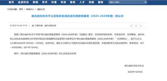 2023年12月4日,经我院积极申报、湖北省科协评定,我院成功获评“湖北省科普教育基地(2024-2028年度)”。