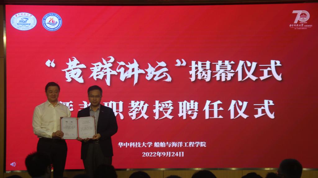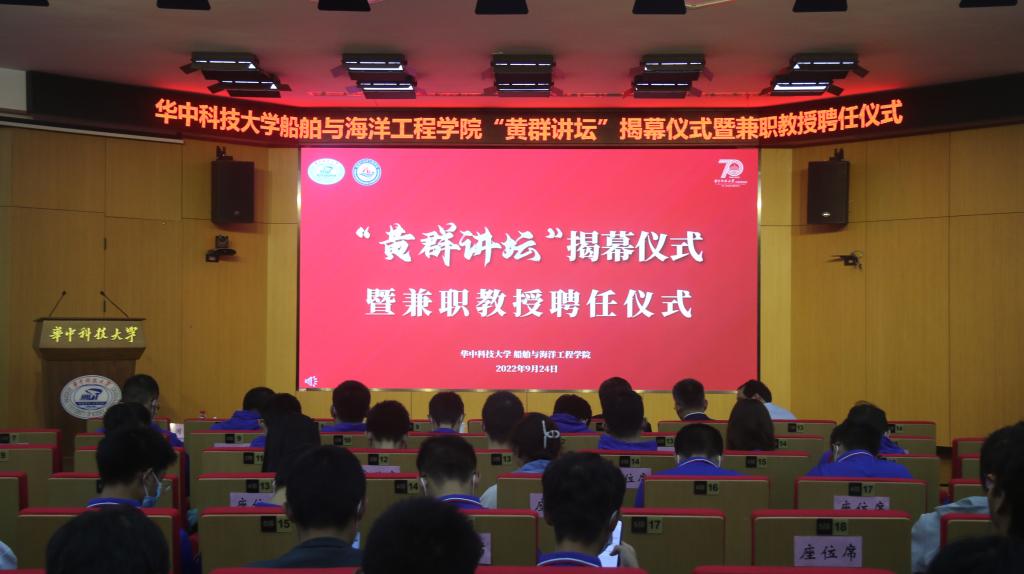 (通讯 刘彪;摄影 刘俊一)喜迎二十大,七秩正青春。为大力弘扬英雄事迹,传承黄群精神,9月24日上午9时,船舶与海洋工程学院“黄群讲坛”揭幕仪式暨兼职教授聘任仪式在国际学术交流中心八号楼求是报告厅举行。