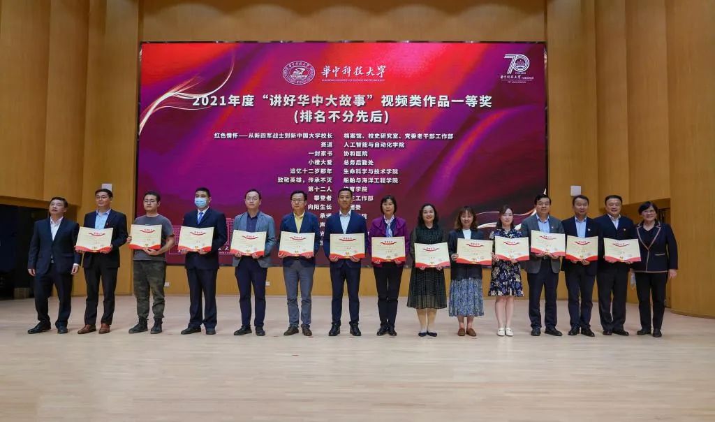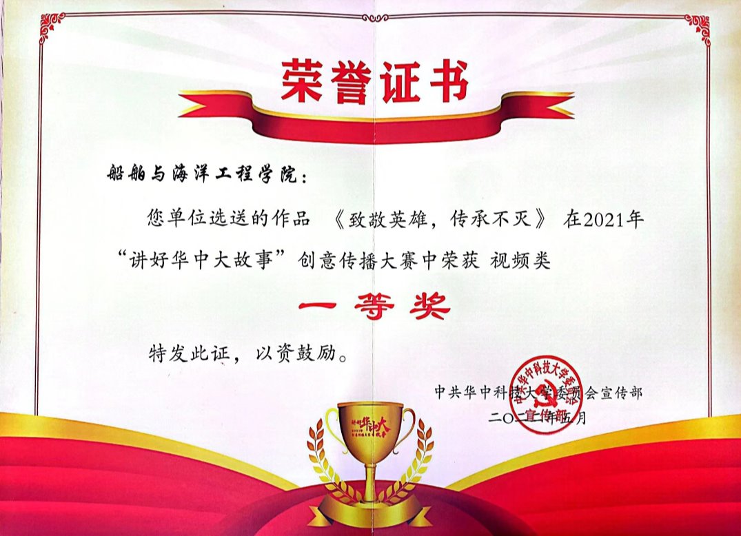 2022年5月20日,华中科技大学于举行了校歌发布仪式暨2022年“讲好华中大故事”分享会,校领导、各单位主要负责人、院系副书记及师生代表等参加活动。校党委副书记谢正学于会上宣读2021年“讲好华中大故事”创意传播大赛表彰名单,船海学院作品《致敬英雄,传承不灭》获得“讲好华中大故事”创意传播大赛视频类作品一等奖,学院党委书记顾国强作为代表上台领奖。