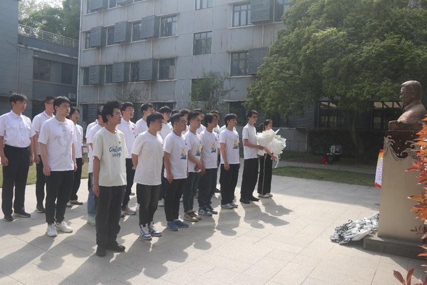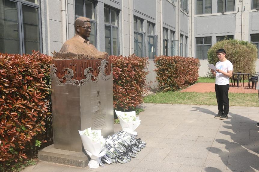 以鲜花寄哀思,以鞠躬致敬意。船海21级本科生第一党支部的胡紫彤与船海专业博士生第二党支部的汪训铭,代表全院师生向黄群塑像敬献鲜花。洁白的花朵寄托着无尽哀思,同学们向黄群师兄集体鞠躬致敬并默哀。现场安静肃穆,每个人心中都涌动着对英雄的无限崇敬。