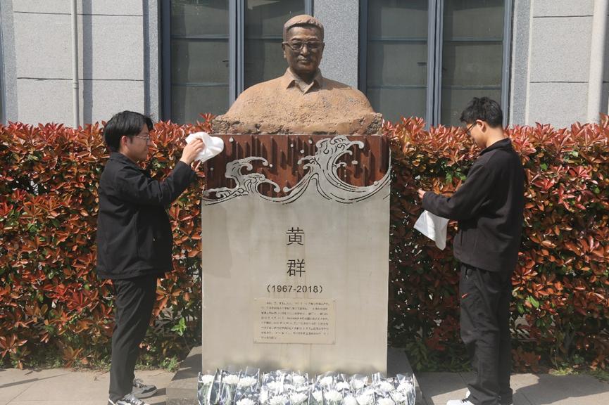 擦拭黄群塑像,擦亮信仰之光。学生代表李星燃和黄源翔怀着崇敬之心,认真细致地擦拭黄群塑像。每一次擦拭都饱含着对黄群师兄深深的敬意与纪念之情,仿佛要将对英雄的追思融入到这塑像的每一寸纹理之中;每一次擦拭都让心中的信仰之光更加明亮,中华民族伟大复兴的中国梦将由一代代中华儿女接力完成。