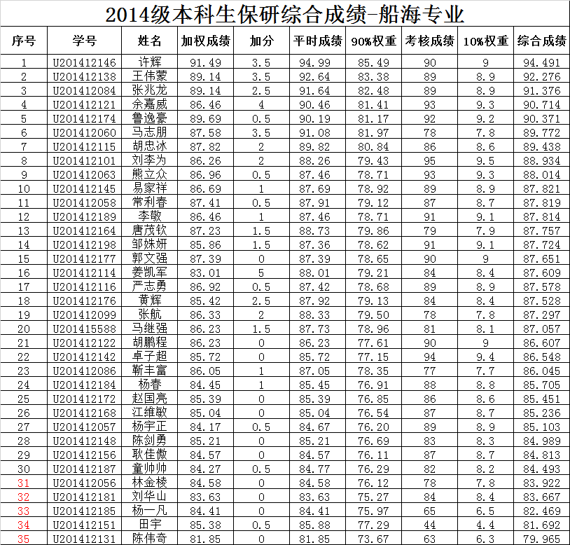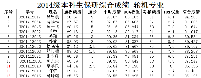 经过笔试,现将2014级船舶与海洋工程专业和轮机工程的保研综合成绩进行公示。对公示结果有异议的同学,可以于9月19日下班前向院办卢慧老师反映(027-87543258)。