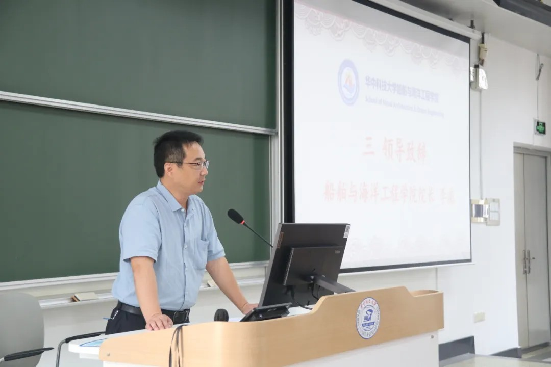 典礼第一项,船舶与海洋工程学院院长李威教授致辞。李威寄语新生们要与老师同学多交流,对个人发展多考虑,对学习科研多投入;同时应转换角色、树立目标、学会适应、不怕挫折、脚踏实地、全面发展,为自己今后人生道路奠定良好的基础。