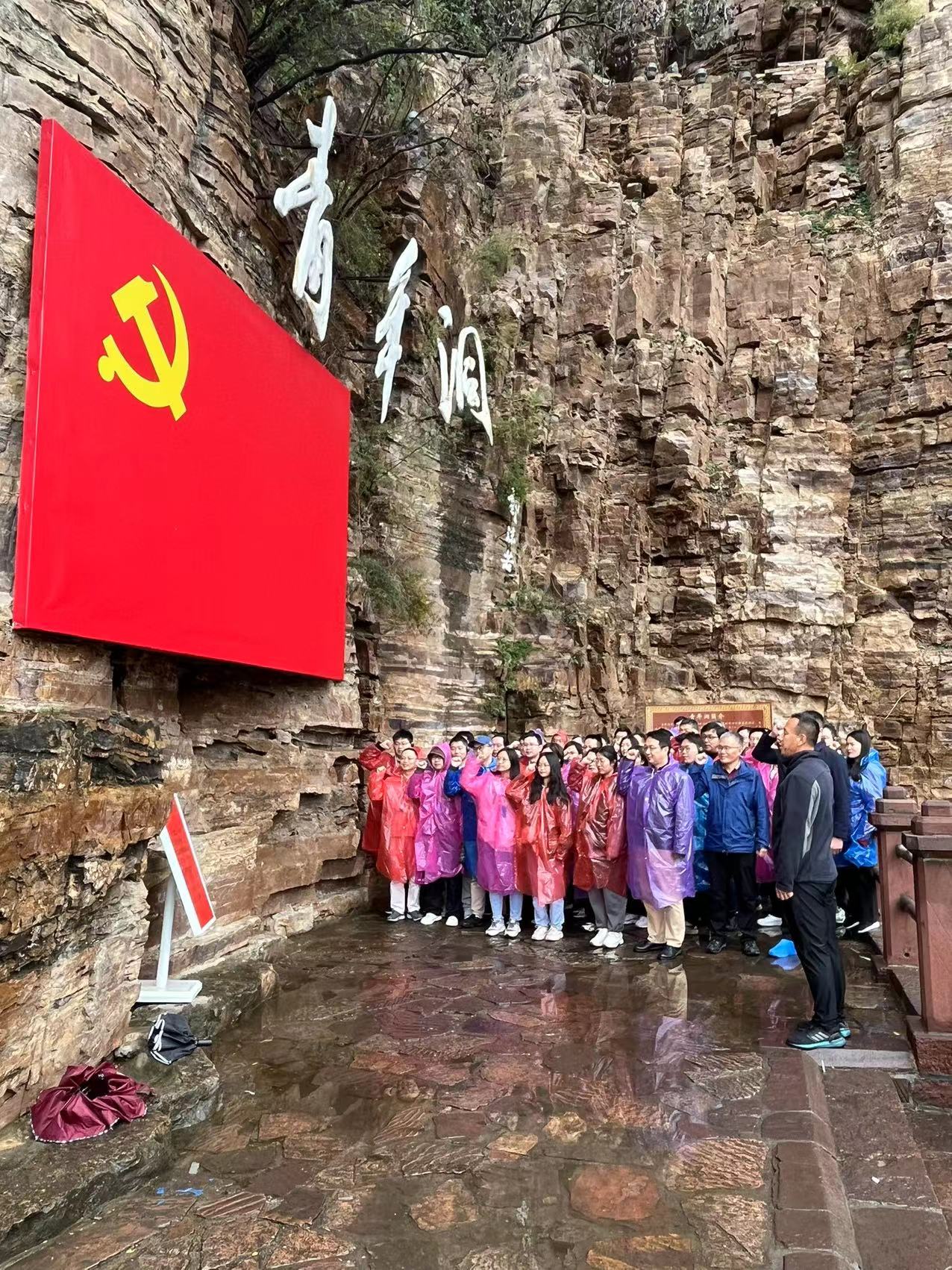 11月5日上午,在连绵细雨中,研学党员们沿着习近平总书记的脚步,重走红旗渠咽喉工程之一——青年洞。青年洞为红旗渠总干渠最长的隧洞,由青年突击队在艰难困境中凿通,为表彰青年们艰苦奋斗的业绩,将此洞命名为“青年洞”。通过实地参观调研虎口崖、鹰嘴山等标志性地点,研学党员充分体悟了修渠的艰辛困难。在青年洞前,学院党委书记顾国强带领全体教工党员重温入党誓词。