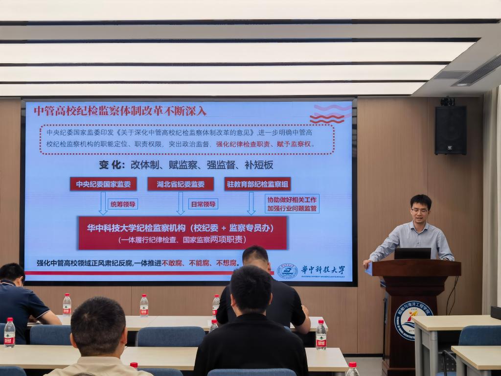 为深入贯彻落实党中央关于加强党风廉政建设的决策部署,进一步严明纪律规矩,营造风清气正的校园政治生态,6月12日下午,华中科技大学船海学院特邀校纪检监察机构刘欢老师为全院师生开展学习贯彻中央八项规定精神专题报告。活动由学院党委副书记、纪委书记李周密主持。