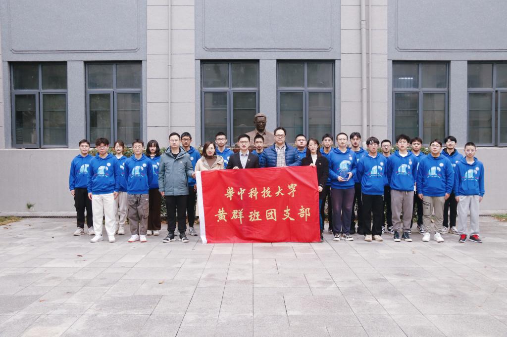 主题团日活动上,船卓2001班团支部团员代表向黄群雕像敬献花环,向英雄校友致敬。