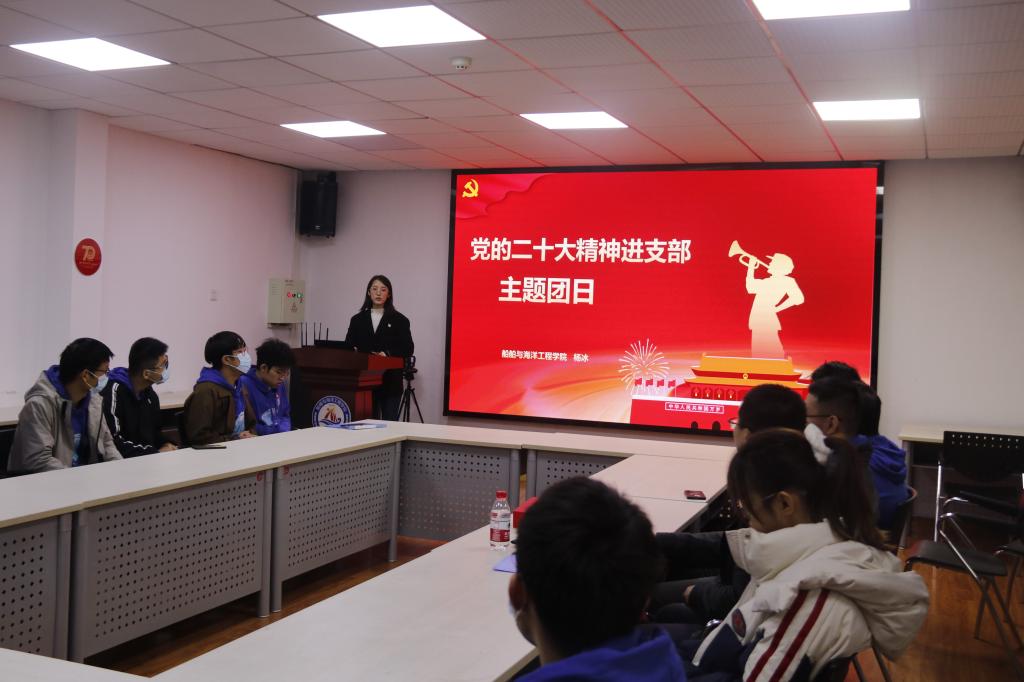 船海学院团委书记杨冰主持黄群班团支部示范主题团日活动,与黄群班团支部成员就党的二十大精神学习、文化自信自强等方面展开交流讨论。