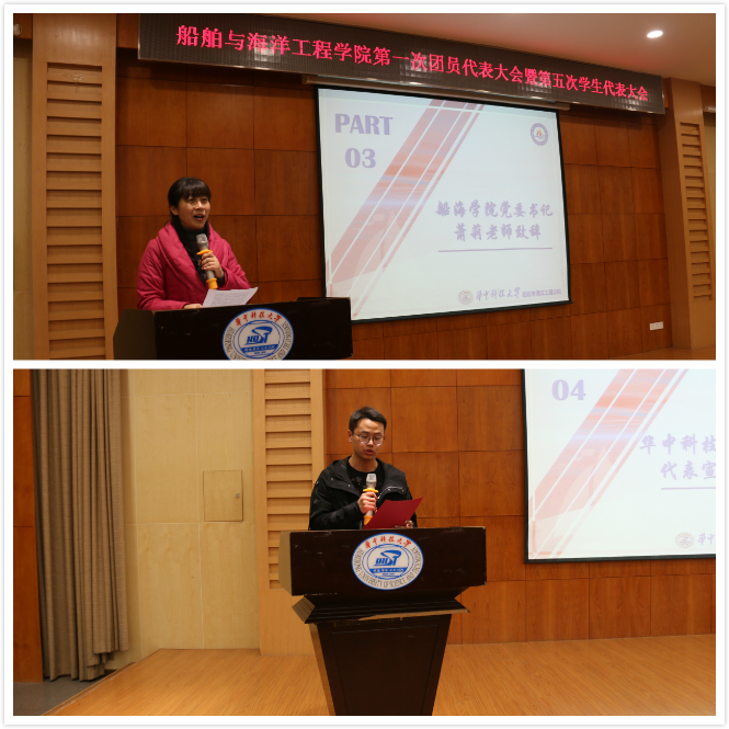 船舶与海洋工程学院分团委副书记徐航代表第十届分团委作2017年度工作报告,学生会主席周智毅代表第十届学生会作2017年度工作报告,研究生会主席闫俊平代表研究生会作2017年度工作报告,学生会副主席郭晓冉作2017年提案报告。