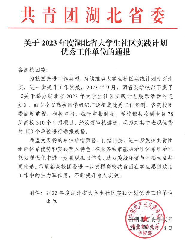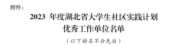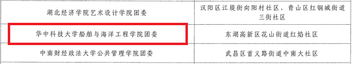 (通讯员:张石磊)2023年12月8日,共青团湖北省委公布了2023年度湖北省大学生社区实践计划优秀工作单位名单。华中科技大学船海学院团委名列其中。