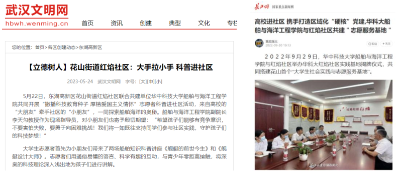社区青少年对华科大船海学院的科普实践活动非常喜欢、报名踊跃,两个社区的区民也对船海学院的志愿科普活动以及青年志愿者团队高度评价。船海学院所开展的一系列社区志愿科普活动也曾受到学习强国、长江网、武汉文明网、光谷青年、楚天读书报等多家媒体报道。