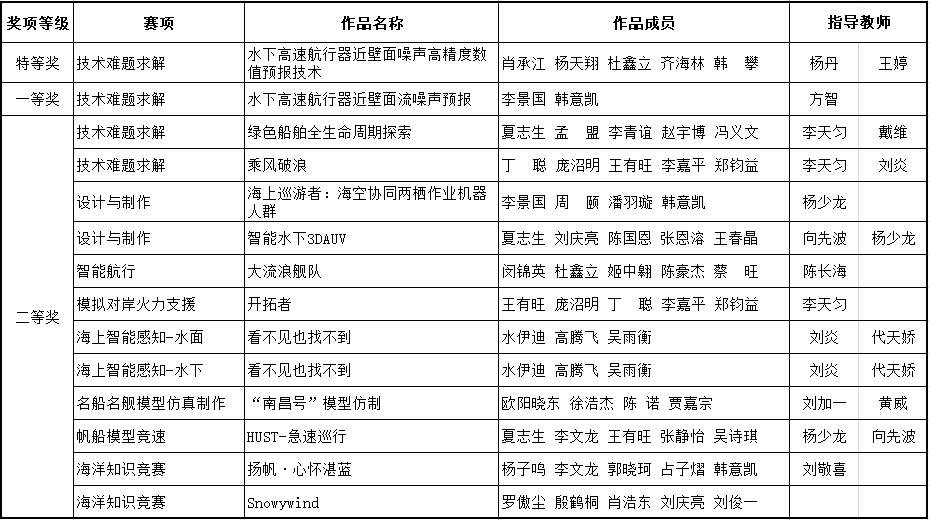 8月13-14日,第十一届全国海洋航行器设计与制作大赛暨2022海上争锋智能挑战赛在西北工业大学举行。华中科技大学船舶与海洋工程学院多支学生科创团队进入全国总决赛,共获得1项特等奖、1项一等奖、12项二等奖。