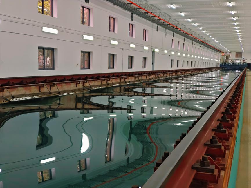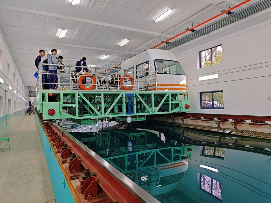 最让学生们兴奋的是亲身体验拖曳水池实验装置。宋磊老师和李阳老师带领学生登上船池拖车系统。在实验中,学生们亲眼见证了船模在水中的运动情况,并了解了水池实验的数据采集和分析过程。